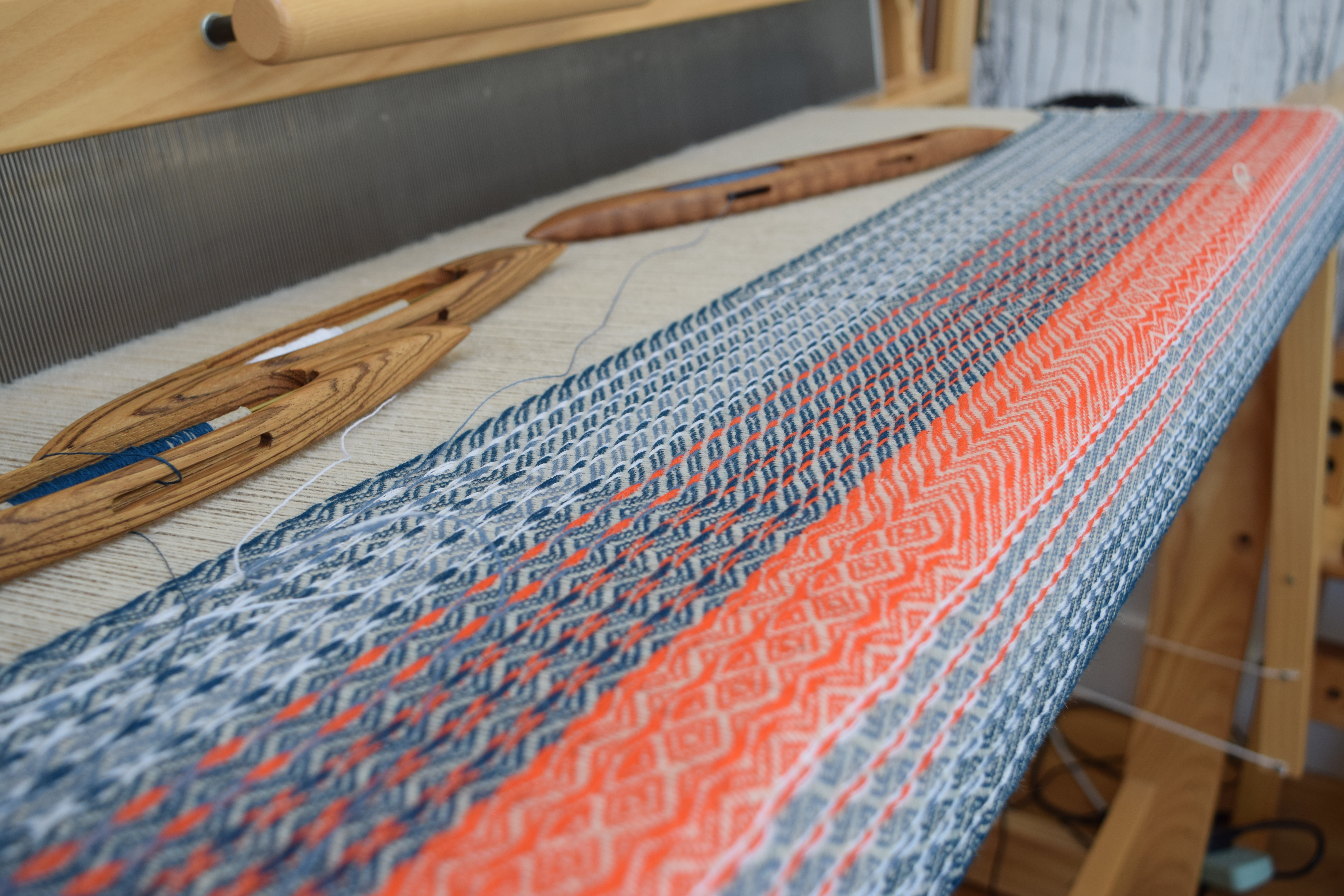 I was lucky enough to discover very local shepherdess at Lammermuir Wool when attending Perth Wool Festival a few years ago. I had been hoping to use some of her Shetland wool in my weaving and found this the perfect project to include some hyper-local yarn. The natural warp was therefore wound with wool from Lammermuir Wool and then contrasted in the weft with bright hues of worsted wool from Weaver’s Bazaar!