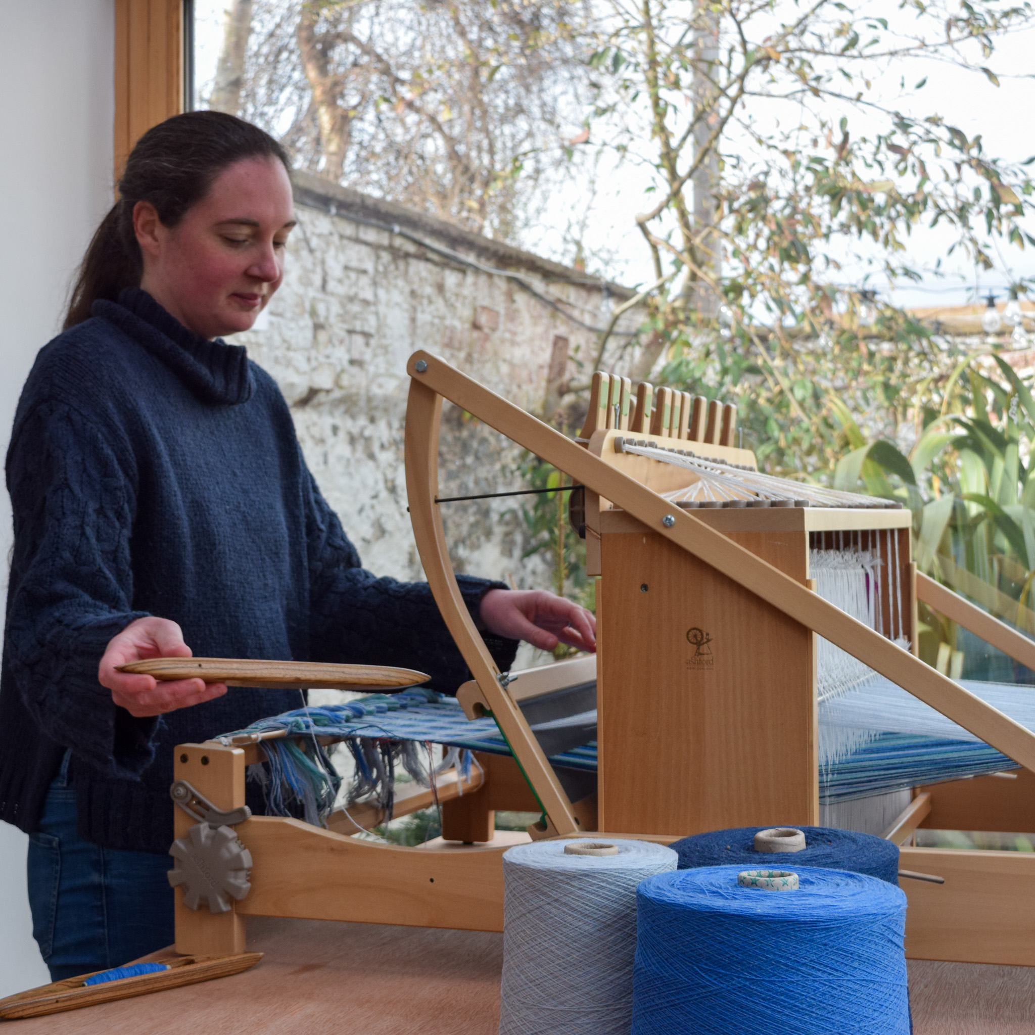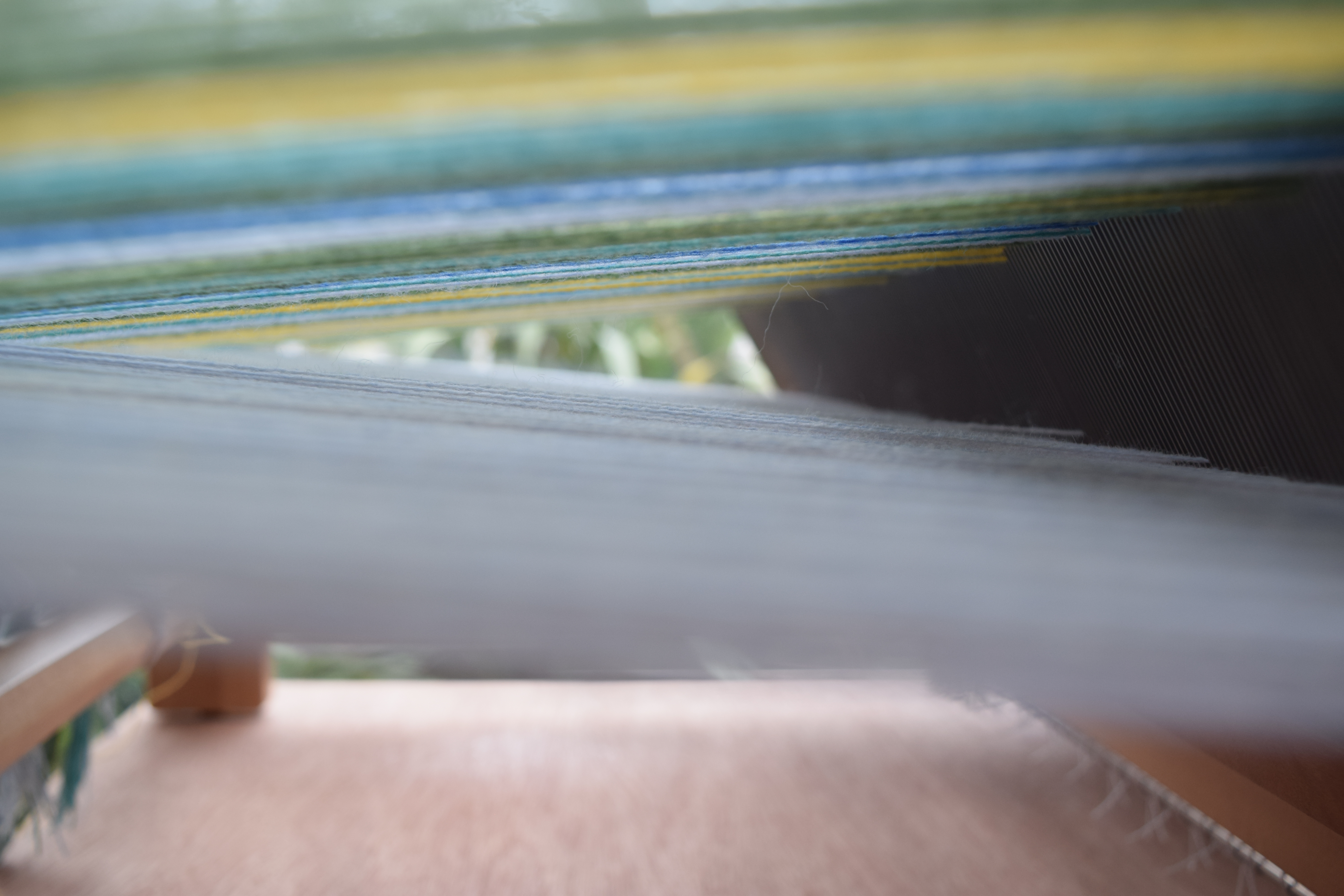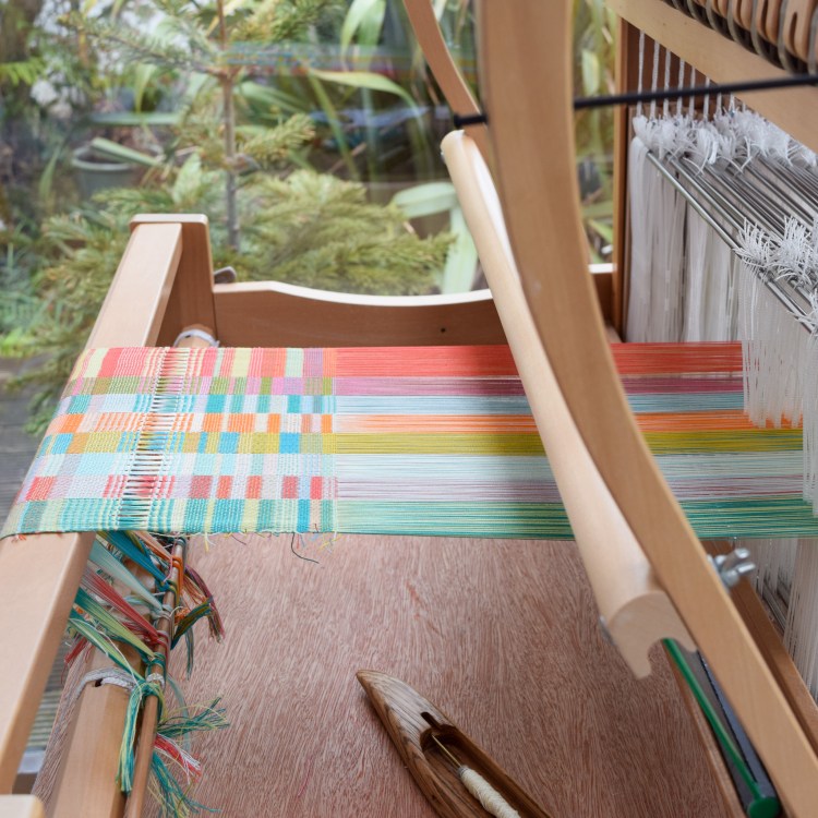 A further source of inspiration for the Spring Rewound event was tulips. I love to work in block weaves and experimenting with colour in double weave blocks. Taking my inspiration from the tulip fields of The Netherlands, I decided to create a limited set of three woven art pieces. Woven in fine cotton with an array of bright hues, these were a joy to weave, all using the same warp but each individual in their block placements and weft colour combinations. The final pieces also remind me of a sea of deck chairs on the beach and so I named them High Days and Holidays.