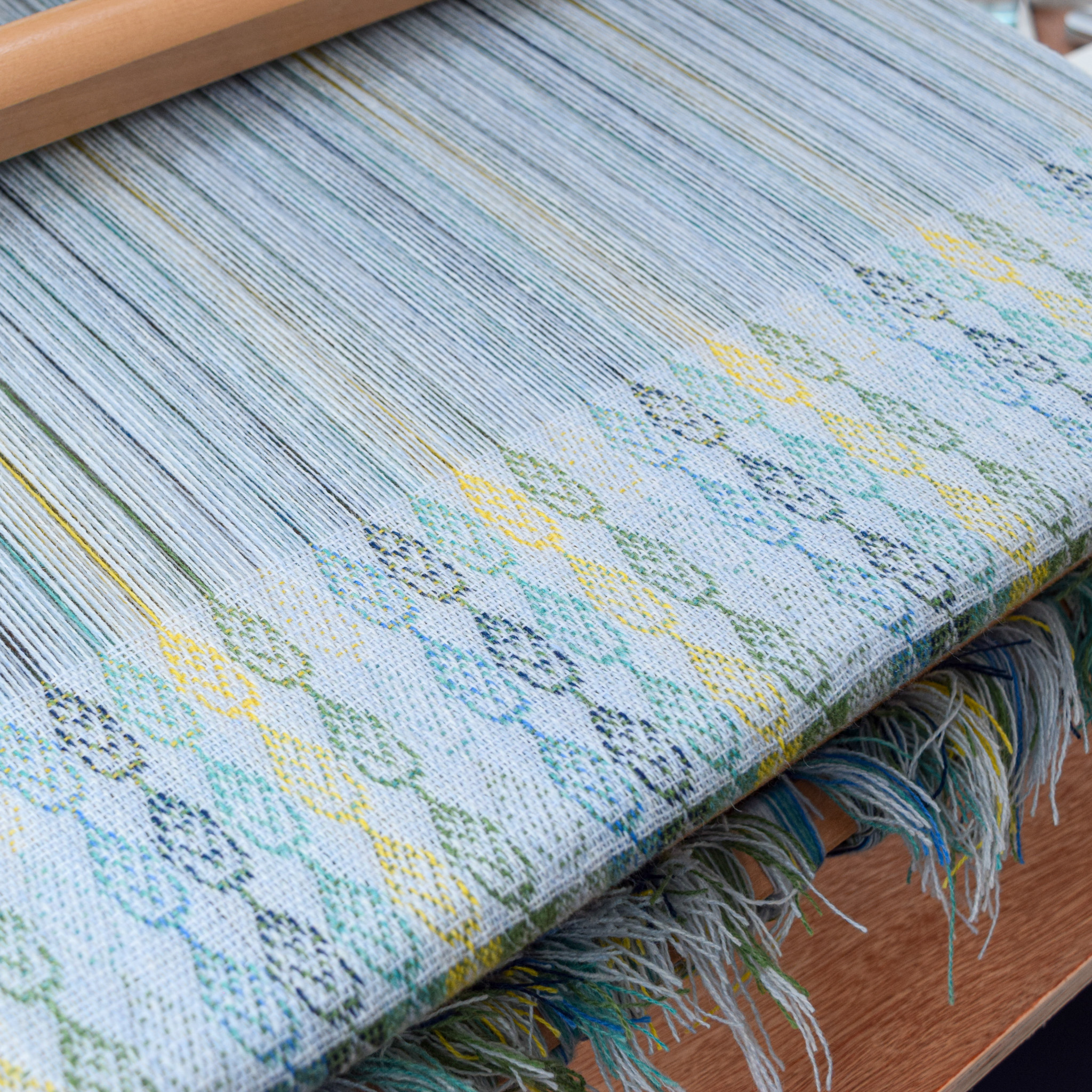 I had previously designed a cloth with naturally dyed merino wool in a leaf motif for an interior autumn collection. I thought it would be lovely to revisit this work but with a palette of fresh colours denoting spring leaves on lights spring days. This Spring Leaves fabric was woven in merino lambswool in a double weave cloth.